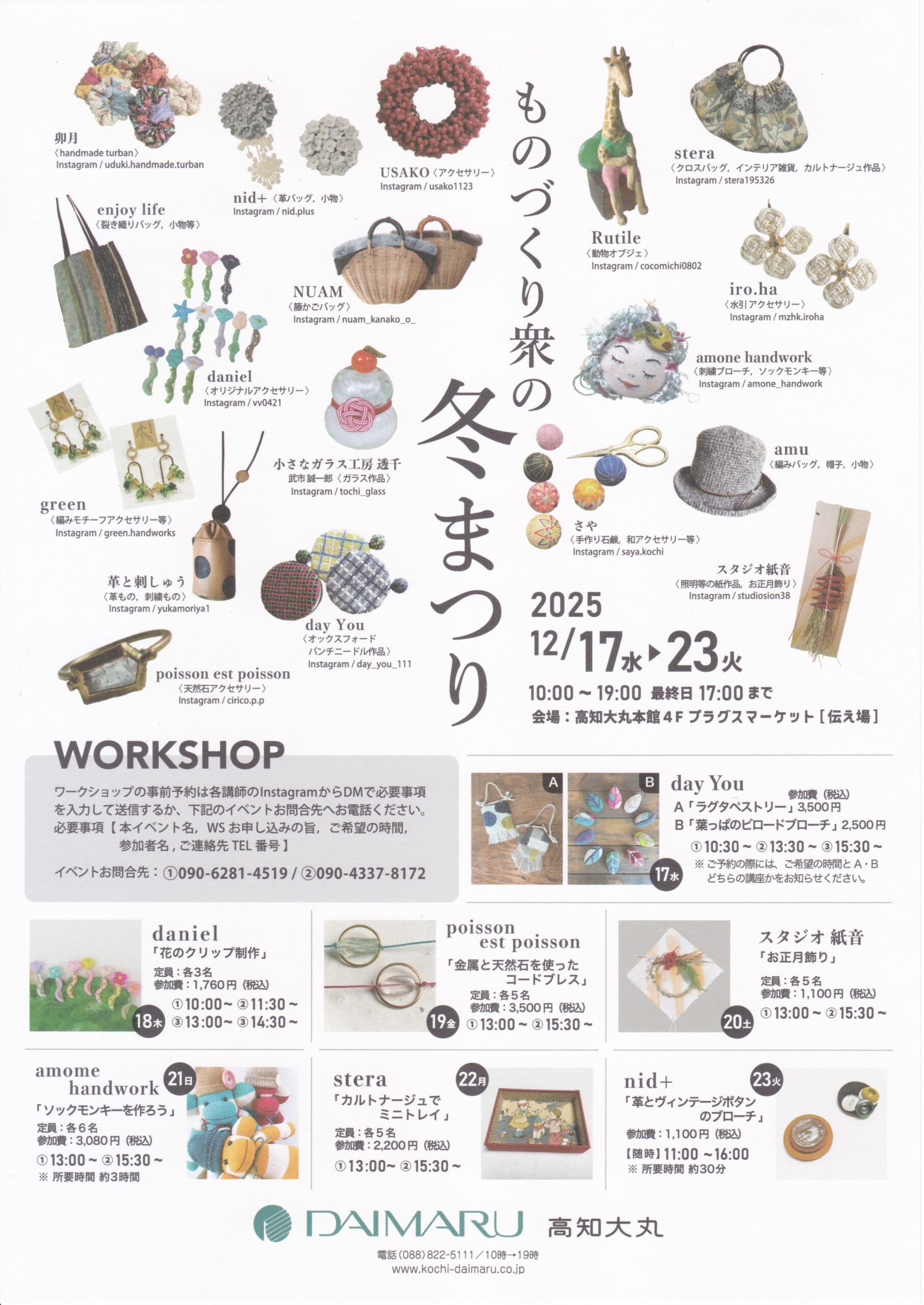 | 【newイベント情報】 高知大丸イベントスペースでの dayYou.出店!& 体験WSの開催です💁♀️ 【開催期間】 2025年12/17(水)〜23(火) 10:00~19:00(最終日17:00まで) 会場:高知大丸本館4F プラグスマーケット[伝え場] ※エスカレーター上がってすぐ |
