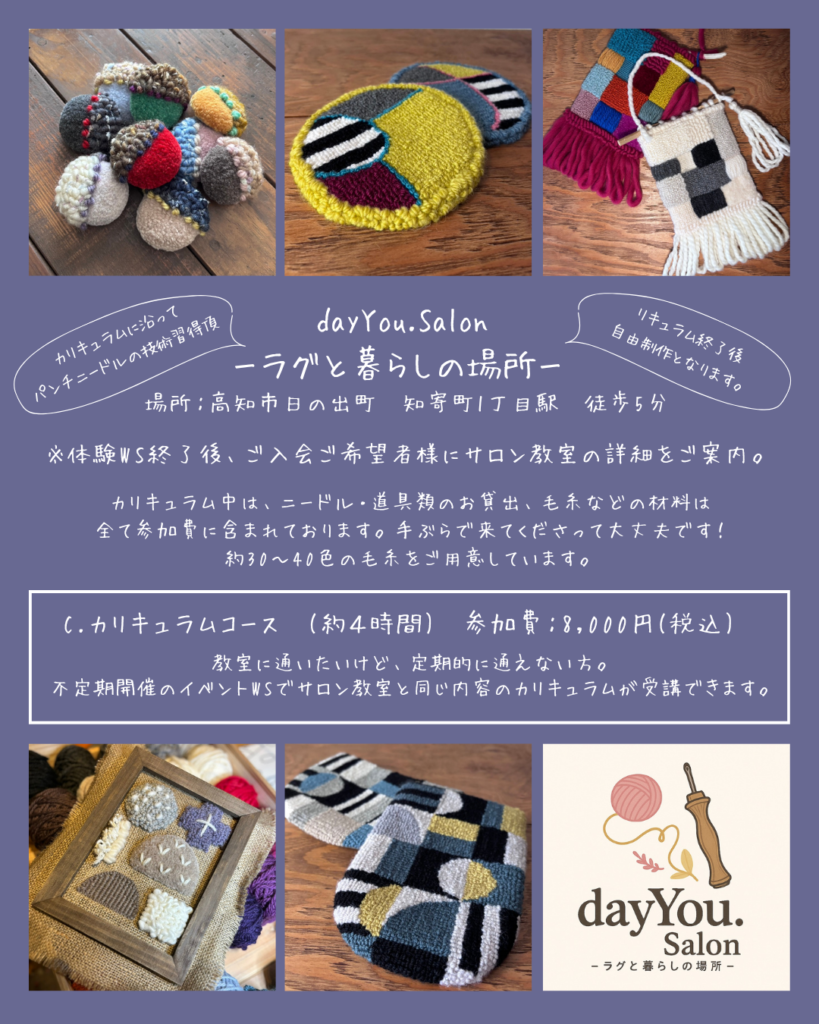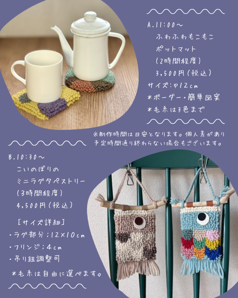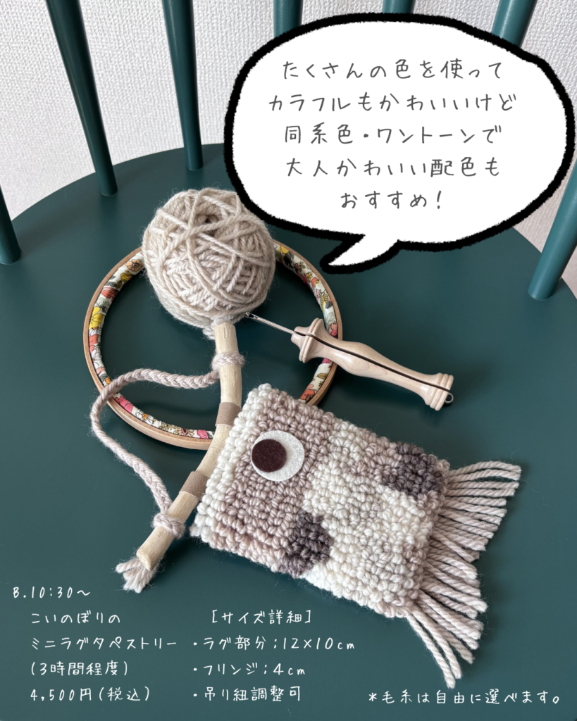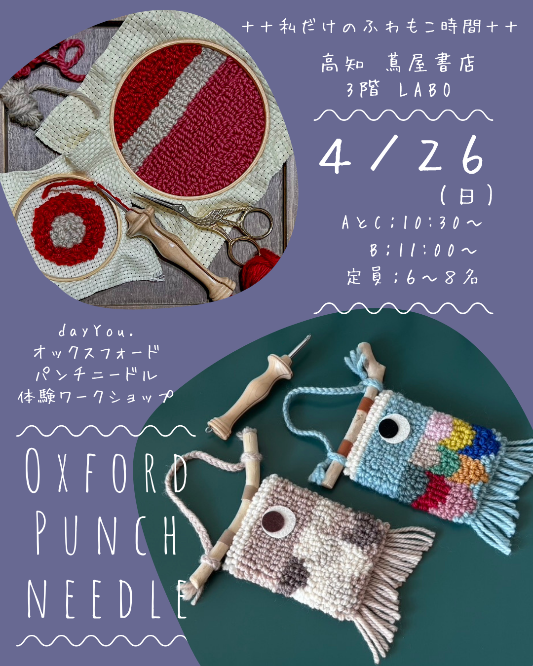 ++私だけのふわもこ時間++ 『オックスフォードパンチニードル』で、 ふわふわもこもこの毛糸小物を作る 体験ワークショップ⭐︎ 日程:2026年4月26日(日) 時間:10:30〜14:30 場所:高知 蔦屋書店 3階 LABO ニードル・道具類のお貸出、毛糸などの材料は 全て参加費に含まれておりますので、 手ぶらで来てくださって大丈夫です🙆♀️ 約30〜40色の毛糸をご用意しています。 【 A、特別体験WS / 3時間程度 】 『こいのぼりの ミニラグタペストリー🎏』 開始時間:10:30〜 参加費:4,500円(税込) 【 B、通常体験WS / 2時間程度 】 『コースターにもなる ふわふわもこもこポットマット』 ボーダー・図形のみ ( キャラクター不可 ) 受付時間:11:00〜 参加費:3,500円(税込) 【 C、カリキュラムコース / 4時間 】 ※ポットマット程度の体験WSを終了されている方 10:30〜14:30 参加費:8,000円(税込) 教室に通いたいけど、定期的に通えない方、 不定期開催のイベントWSでSalon教室の カリキュラムが受講できます。 パンチニードルで本格的なラグを作りたい方! お気軽にご相談ください。 ✺ ✺ ✺ ✺ ✺ ✺ ✺ ✺ ✺ ✺ ✺ ✺ ✺ ✺ ✺ ✺ ✺ ✺ ✺ ✺ 【参加ご希望】 Instagram DMに、下記項目をお送りください。 ①ご希望WS ②受付時間 ③参加人数 ④お名前 ⑤ご年齢 ※複数人での参加の場合、参加者様全員分の ご記入をお願いします。 ※※お子様が参加される場合※※ 10歳以上のお子様でしたら制作可能です。 お連れ様はお一人まで可能です。 椅子のご準備などございますので、 ご予約時にお知らせください。 ✺ ✺ ✺ ✺ ✺ ✺ ✺ ✺ ✺ ✺ ✺ ✺ ✺ ✺ ✺ ✺ ✺ ✺ ✺ ✺ |