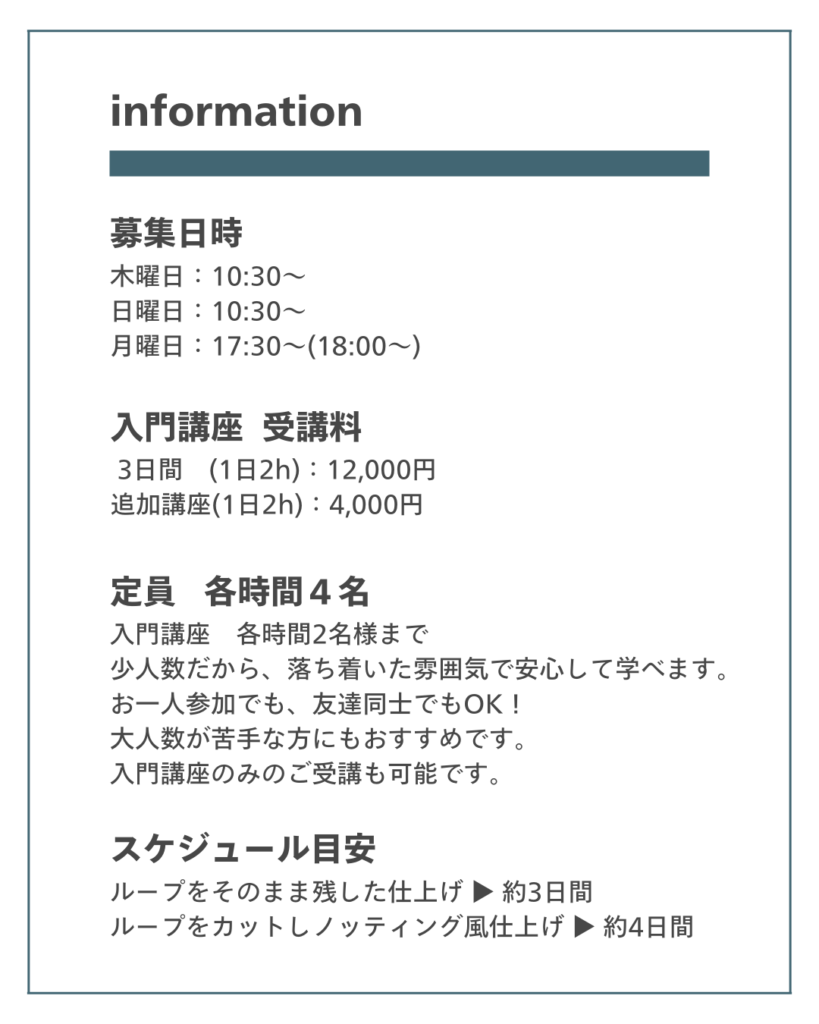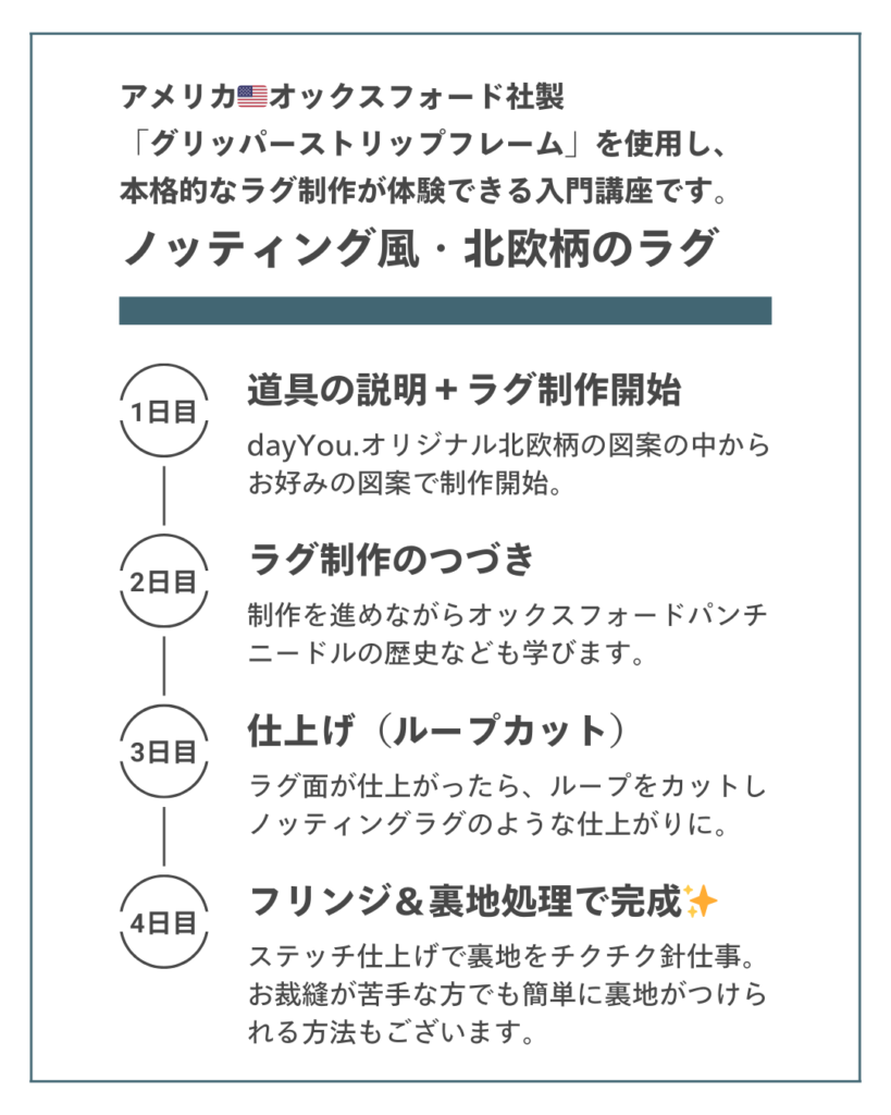 | 🧶はじめてでも本格ラグ作り! オックスフォードパンチニードル入門講座 ✨ チェアパッドにも、タペストリーにも。 暮らしに寄り添う北欧風ラグを手作りできます。 【現在募集日程】 日曜日/10:30〜 木曜日/10:30〜 月曜日/17:30〜(18:00〜可) 1日2時間/3日間12,000円 追加受講(2時間) 4,000円 ※開講日の中で、受講できる日を選んでいただきます。 月1回、月2回、詰めて毎週受講などご希望をお伺い致します。 入門講座だけの受講も可能です。 入門講座を受講後、dayYou.Salonで引き続きオックスフォードパンチニードルを学びたい方は、入会のご説明を致します。 お気軽にお問い合わせください💁♀️ お一人参加も、友達同士も大歓迎です🌿 👉 詳細・お申込みは、InstagramDMまたは、お問い合わせまで📩 [Instagram] dayYou. >>> 作品や日常を綴っています。 dayYou.Salon >>> サロン教室の生徒さん作品や教室の様子を綴っています。 >>>フォロー・いいねよろしくお願いいたします🌿<<< ✺ ✺ ✺ ✺ ✺ ✺ ✺ ✺ ✺ ✺ ✺ ✺ ✺ ✺ ✺ ✺ ✺ ✺ ✺ ✺ 🌿 入門講座は dayYou.Salon 独自のオリジナルメニューです。 初心者でも楽しく学んでいただけるよう考案した内容ですので、無断での複製や営利利用はお控えください。 |